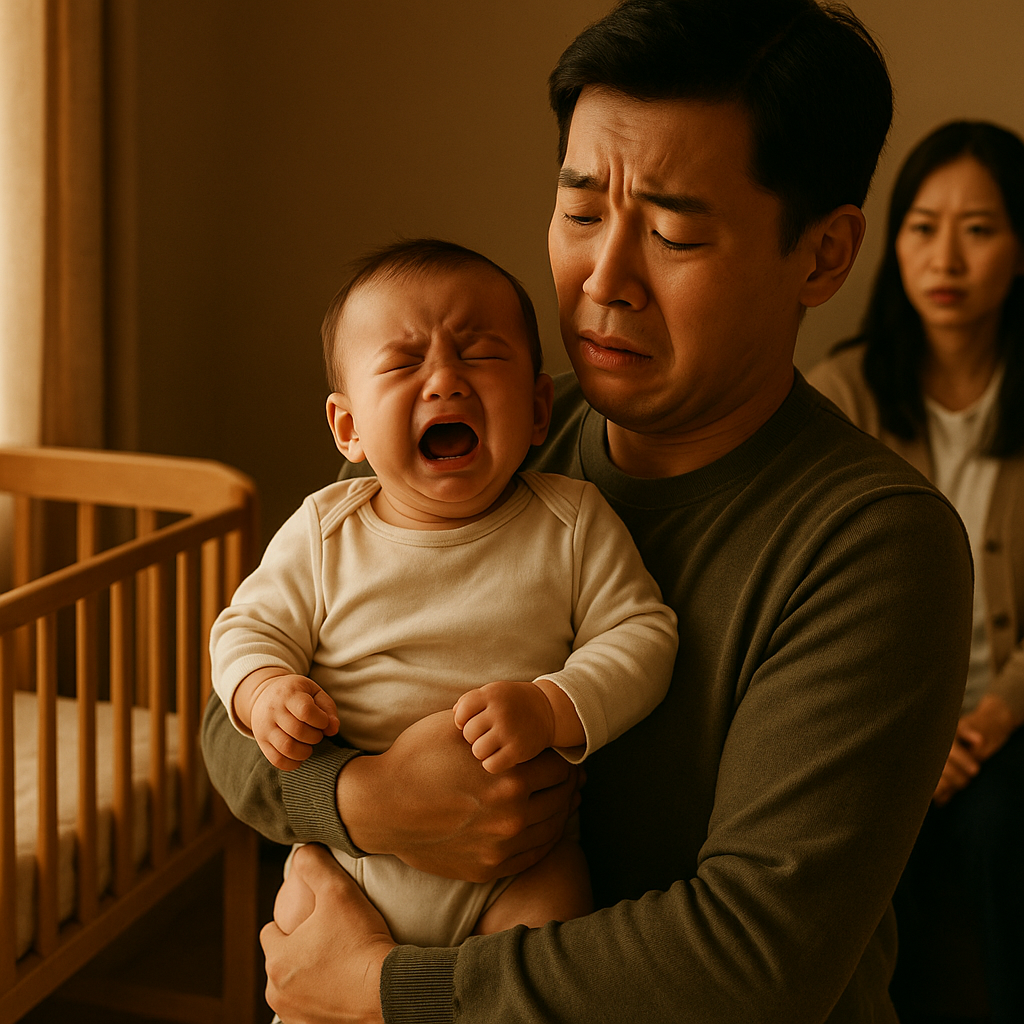 민수는 아기띠를 매고 도윤이를 안고 있다.